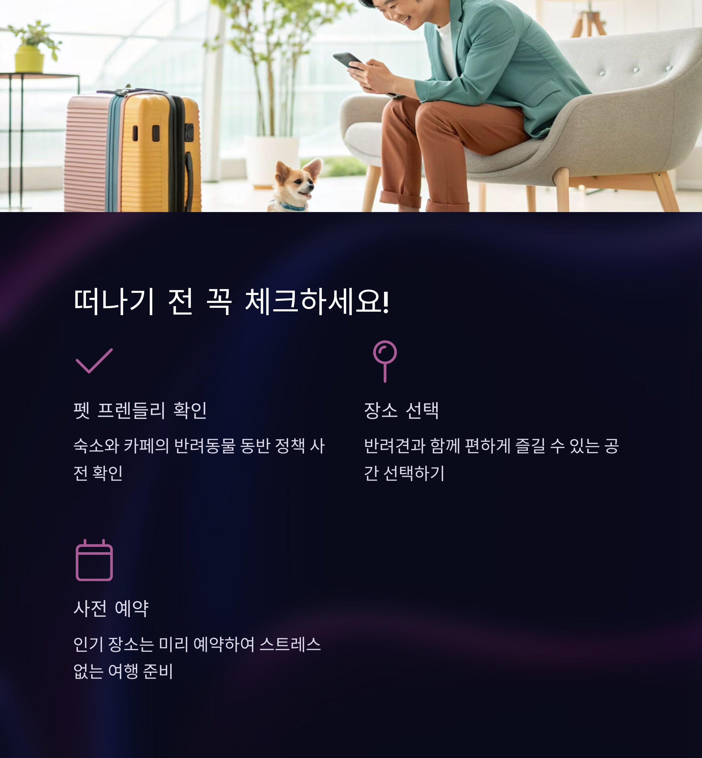| 혼자 여행 추천지 | 펫 동반 가능 지역 | 숙소 선택 팁 |