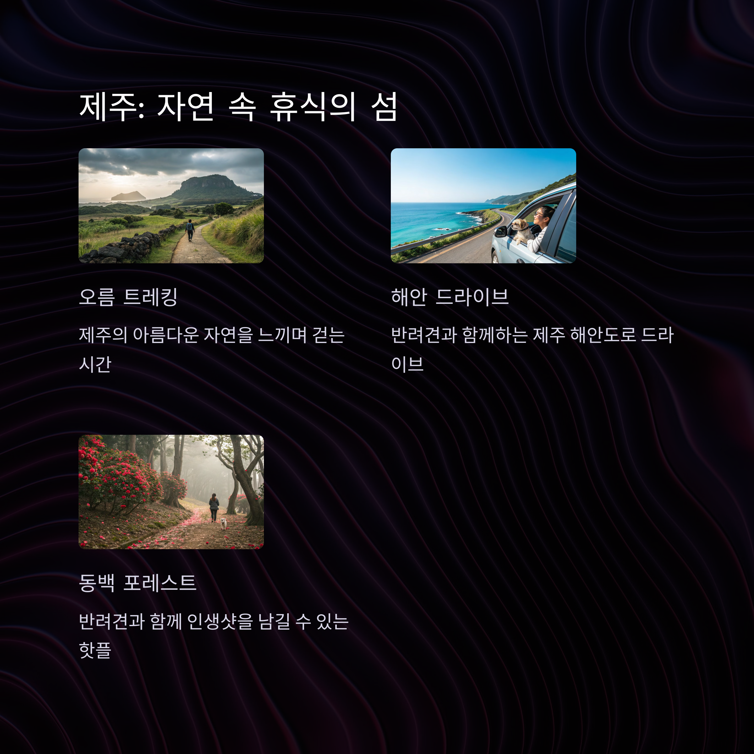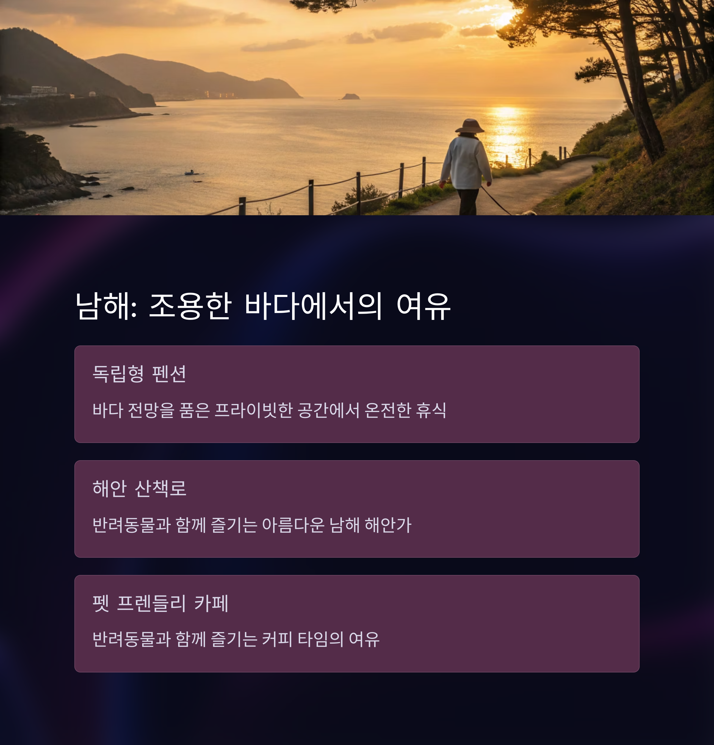 | 반려동물 동반 가능 | 숙소, 카페, 공원 등 펫 프렌들리 공간 정보 제공 |