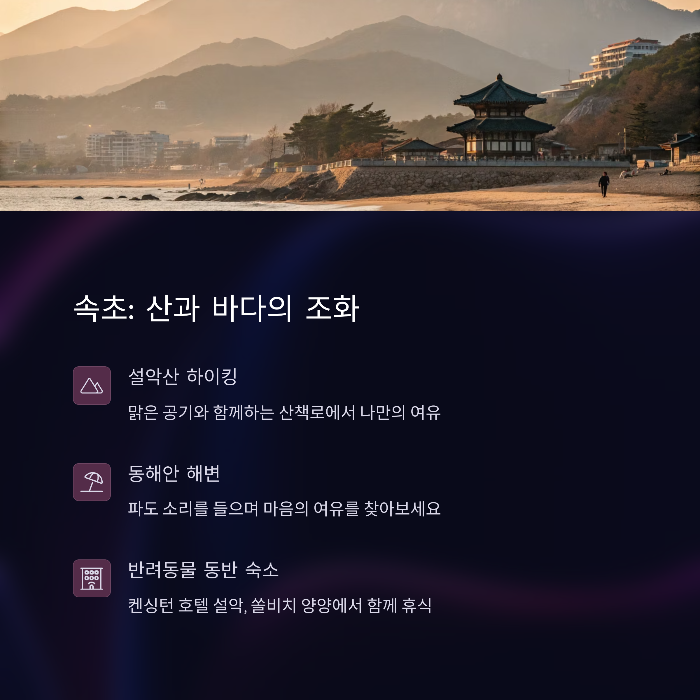 | 속초, 고성, 양양, 남해, 경주, 제주 등 조용한 자연 명소 | 카페, 공원, 캠핑장, 숙소 등 반려동물 동반 가능 여부 | 독채, 펫 프렌들리, 조식 제공, 산책로 인접 여부 고려 |