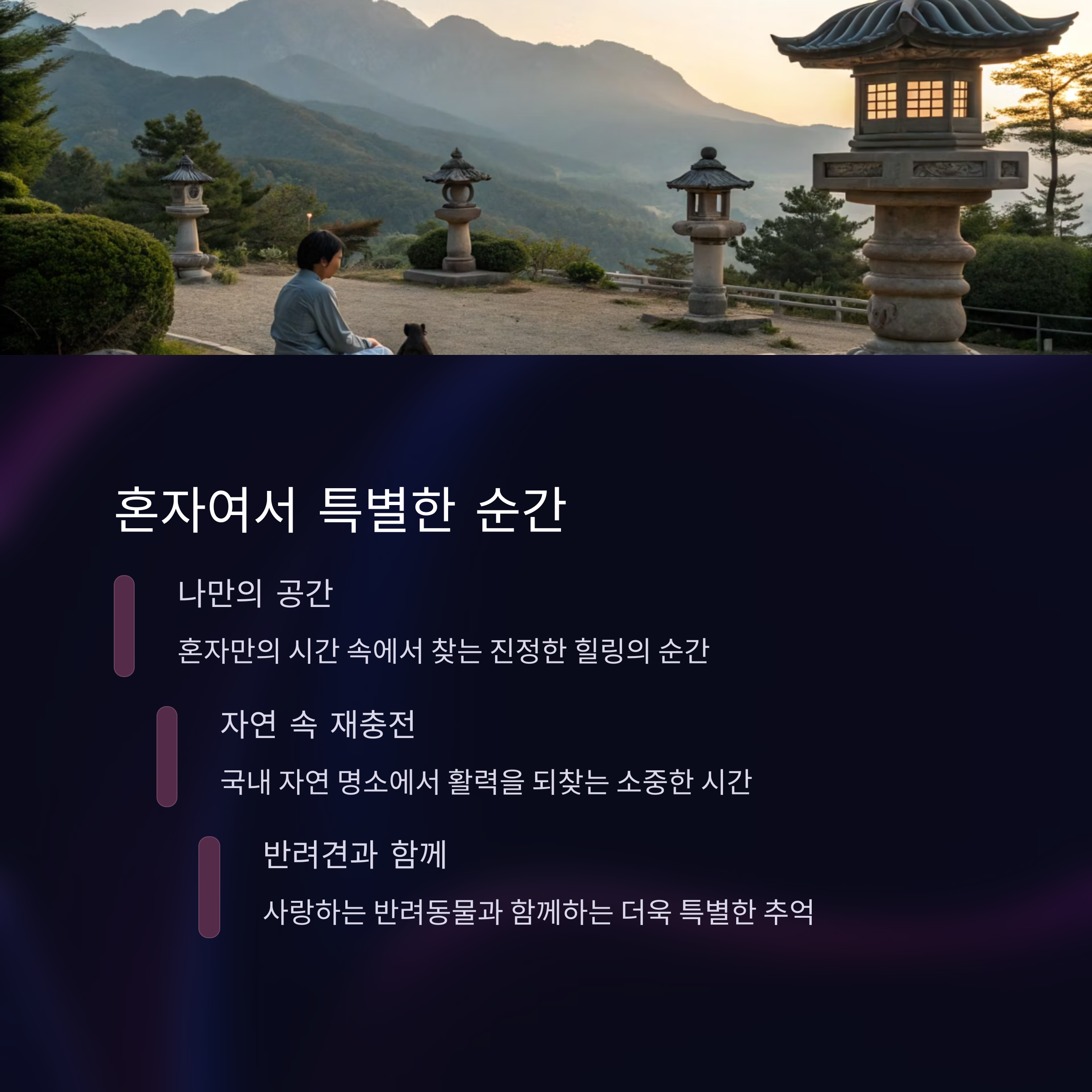 | 혼자 가기 좋은 여행지 | 조용하고 자연 속 여유를 느낄 수 있는 국내 명소 |