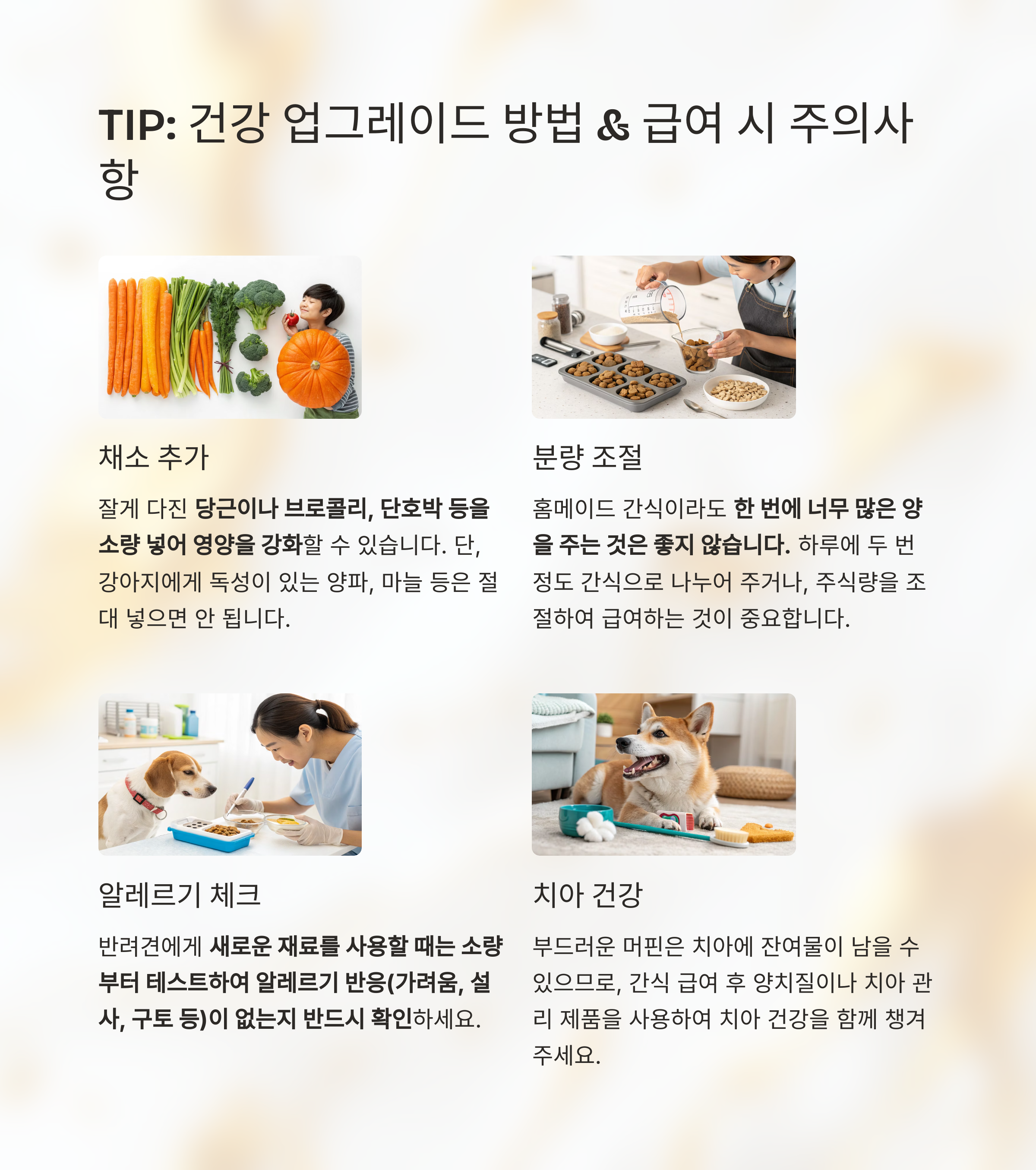 - 알레르기 체크: 반려견에게 새로운 재료를 사용할 때는 소량부터 테스트하여 알레르기 반응(가려움, 설사, 구토 등)이 없는지 반드시 확인하세요.
