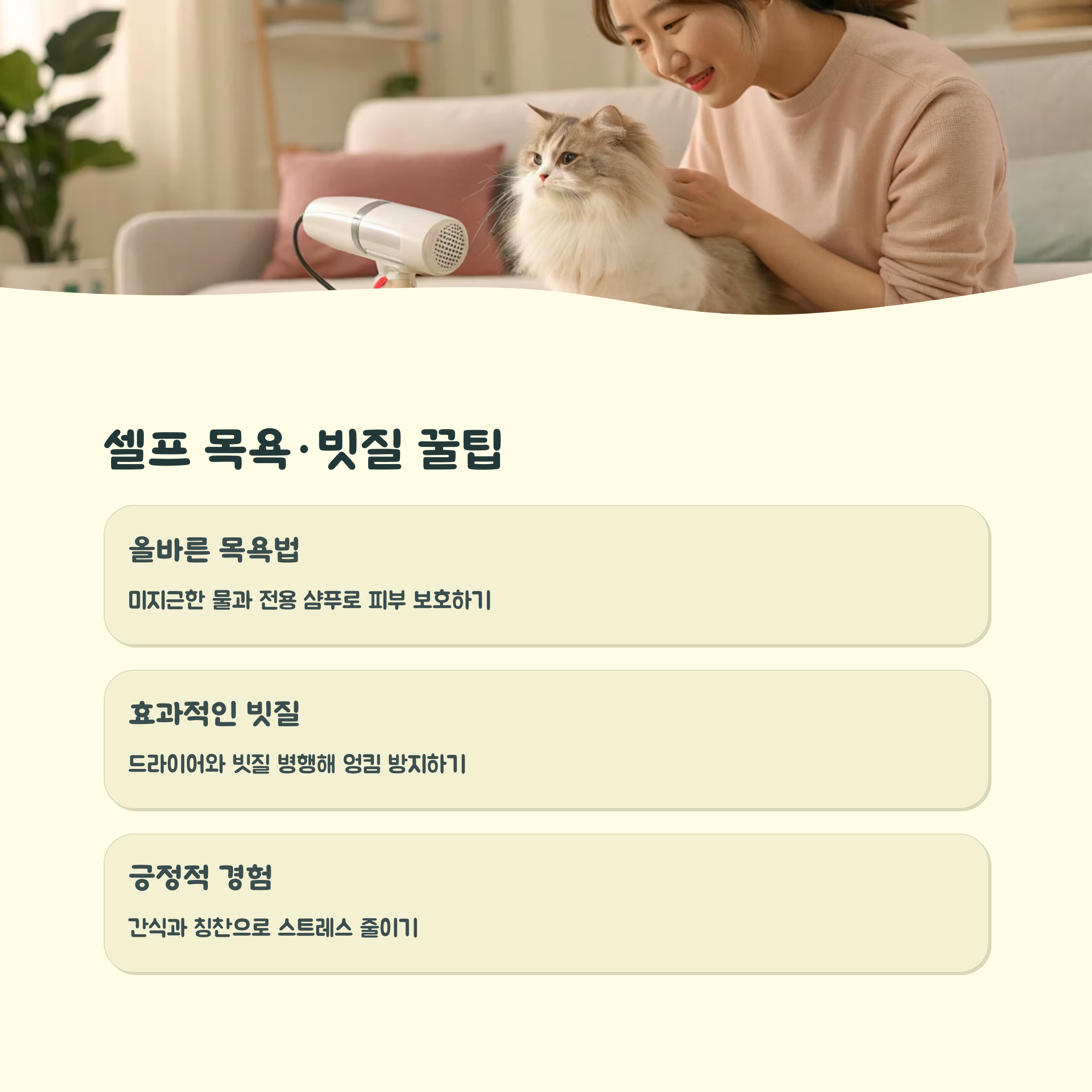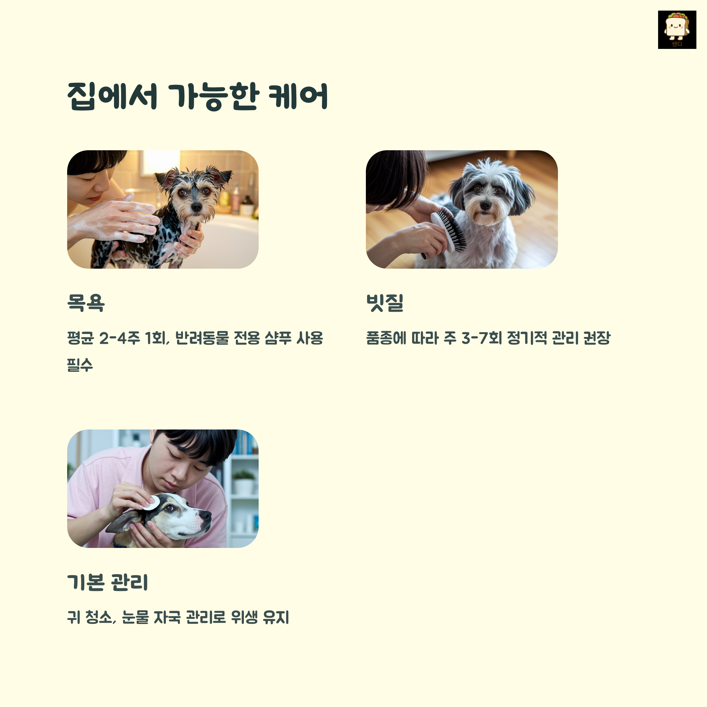 | 셀프 케어 | 집에서 하는 목욕, 기본 빗질 등 간단한 케어 |