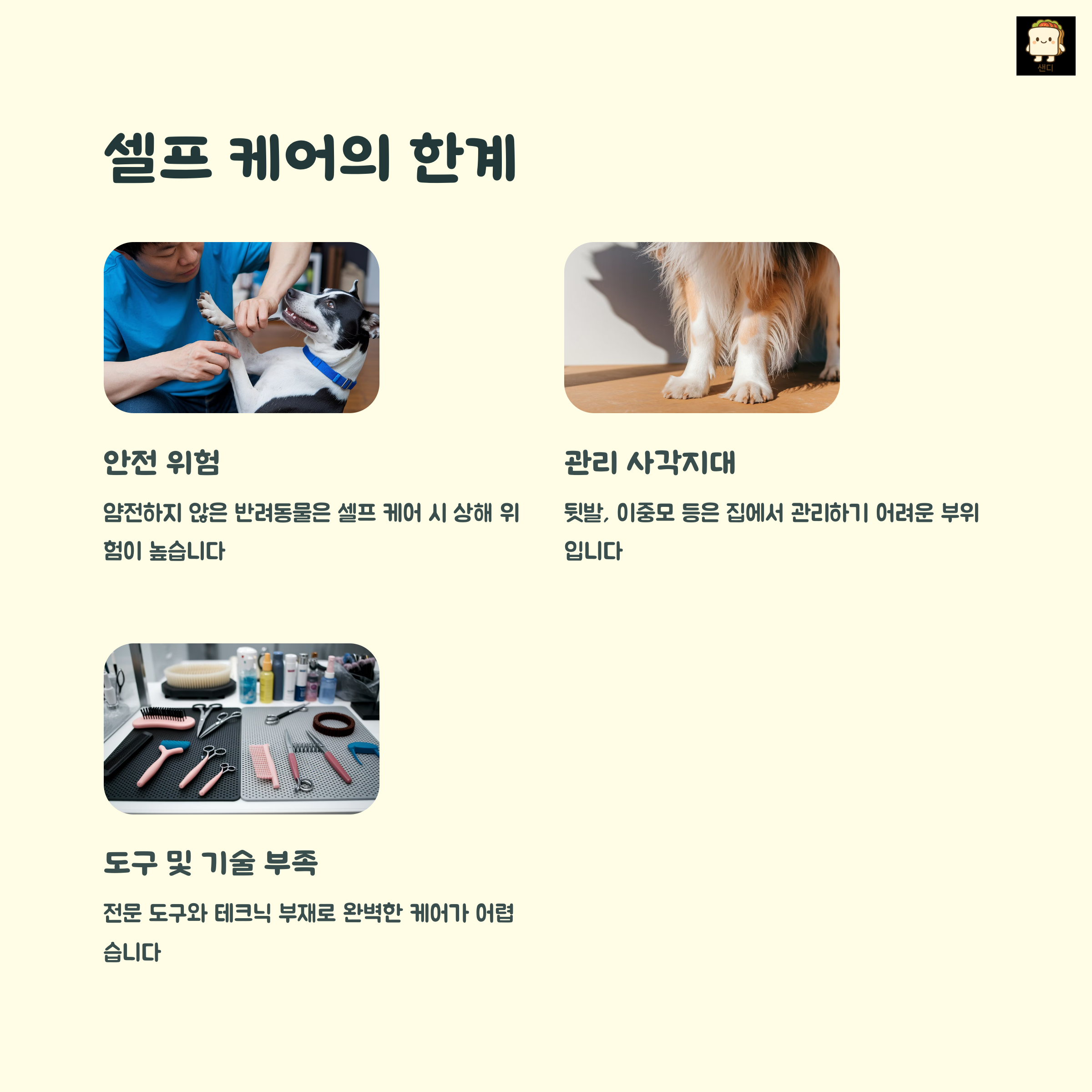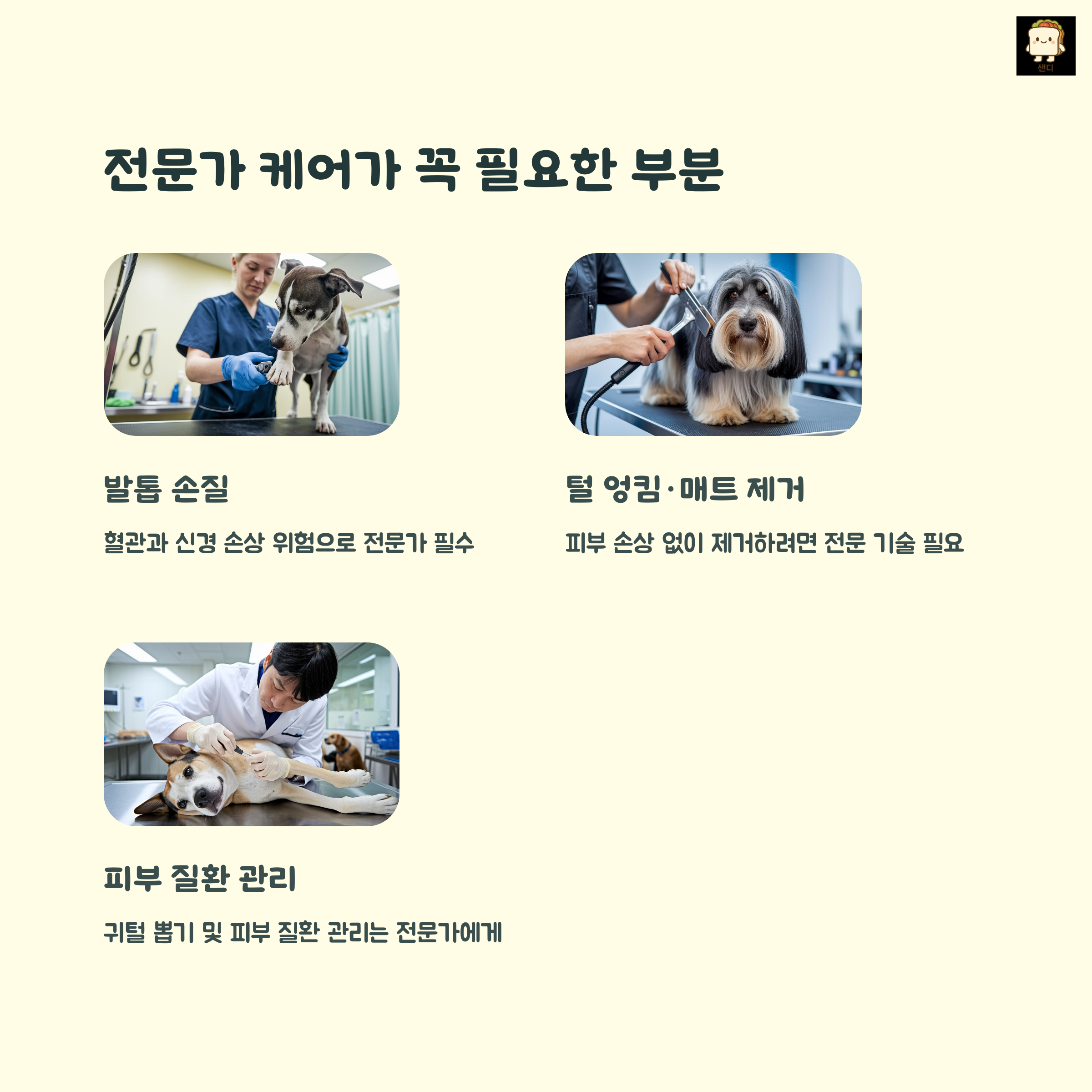 | 기본적인 빗질과 목욕, 간단한 귀 닦기 등 | 발톱, 제모, 귀청소 등 장비와 기술이 필요한 작업 | 아이의 성격, 건강 상태, 작업 난이도에 따라 결정 |