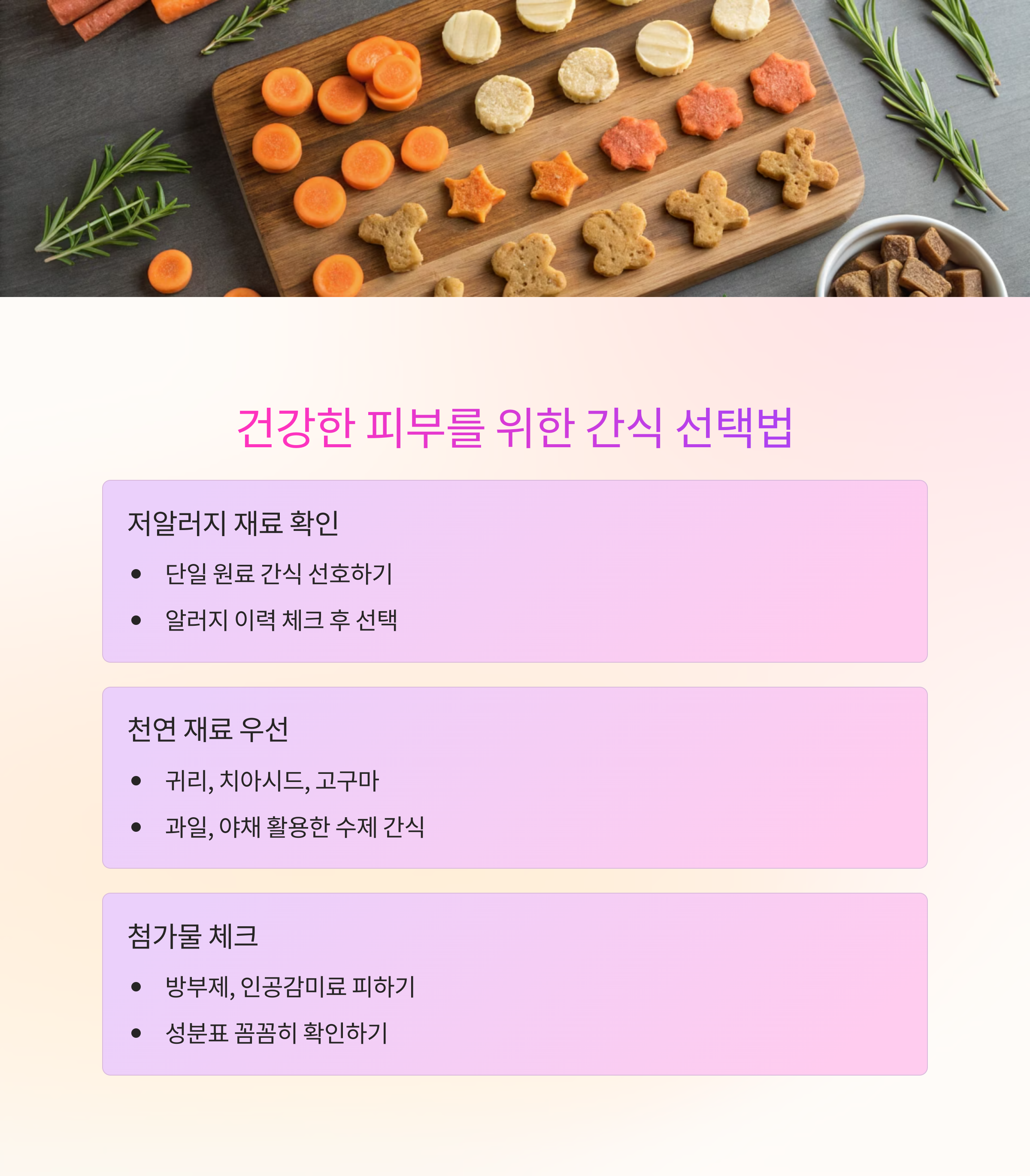 저알러지 간식, 자연재료 간식, 인공첨가물 없는 제품을 중심으로 고르시는 것이 좋아요.
