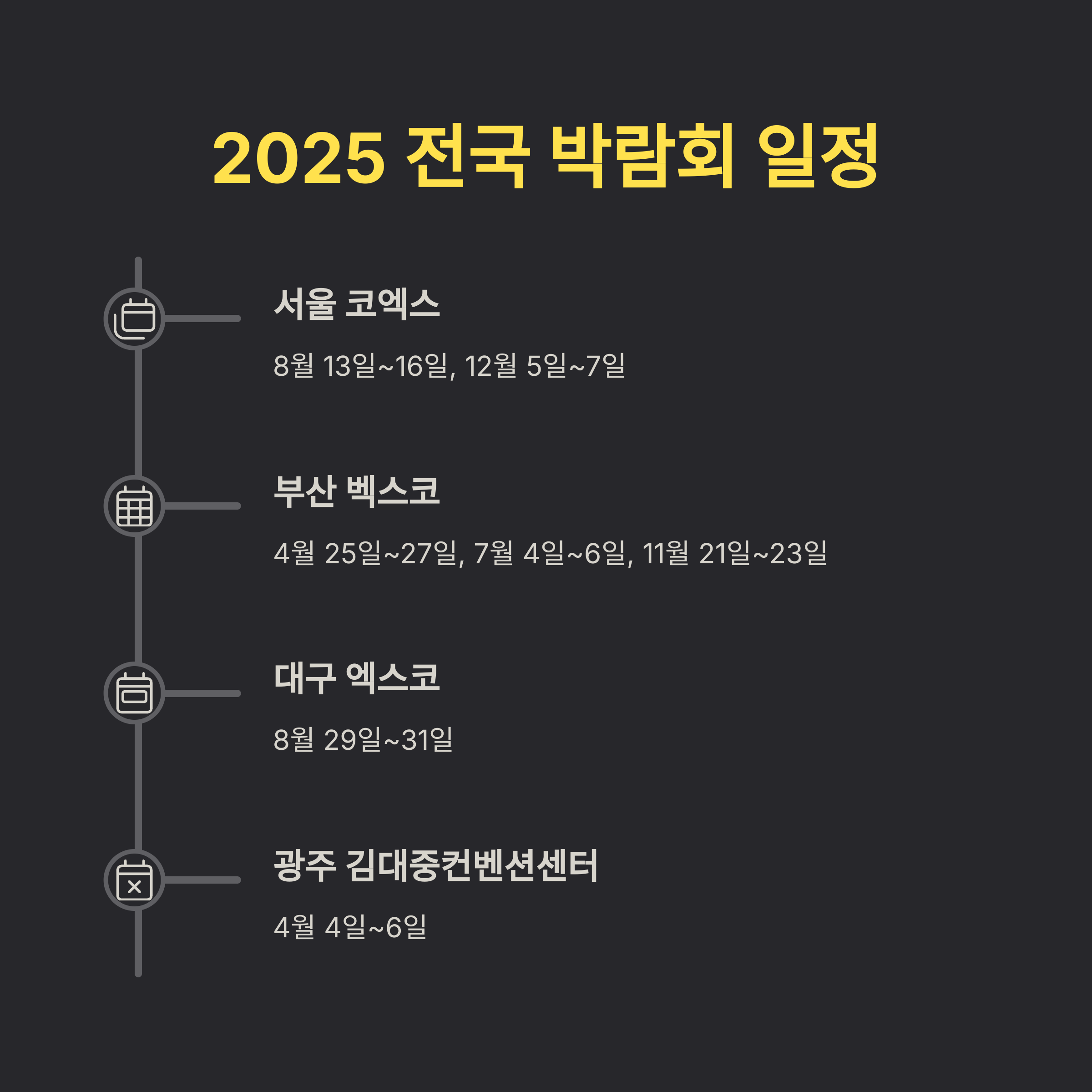 특히 서울 코엑스 박람회는 5월 2일부터 5일까지 열리며, 최대 규모를 자랑합니다.