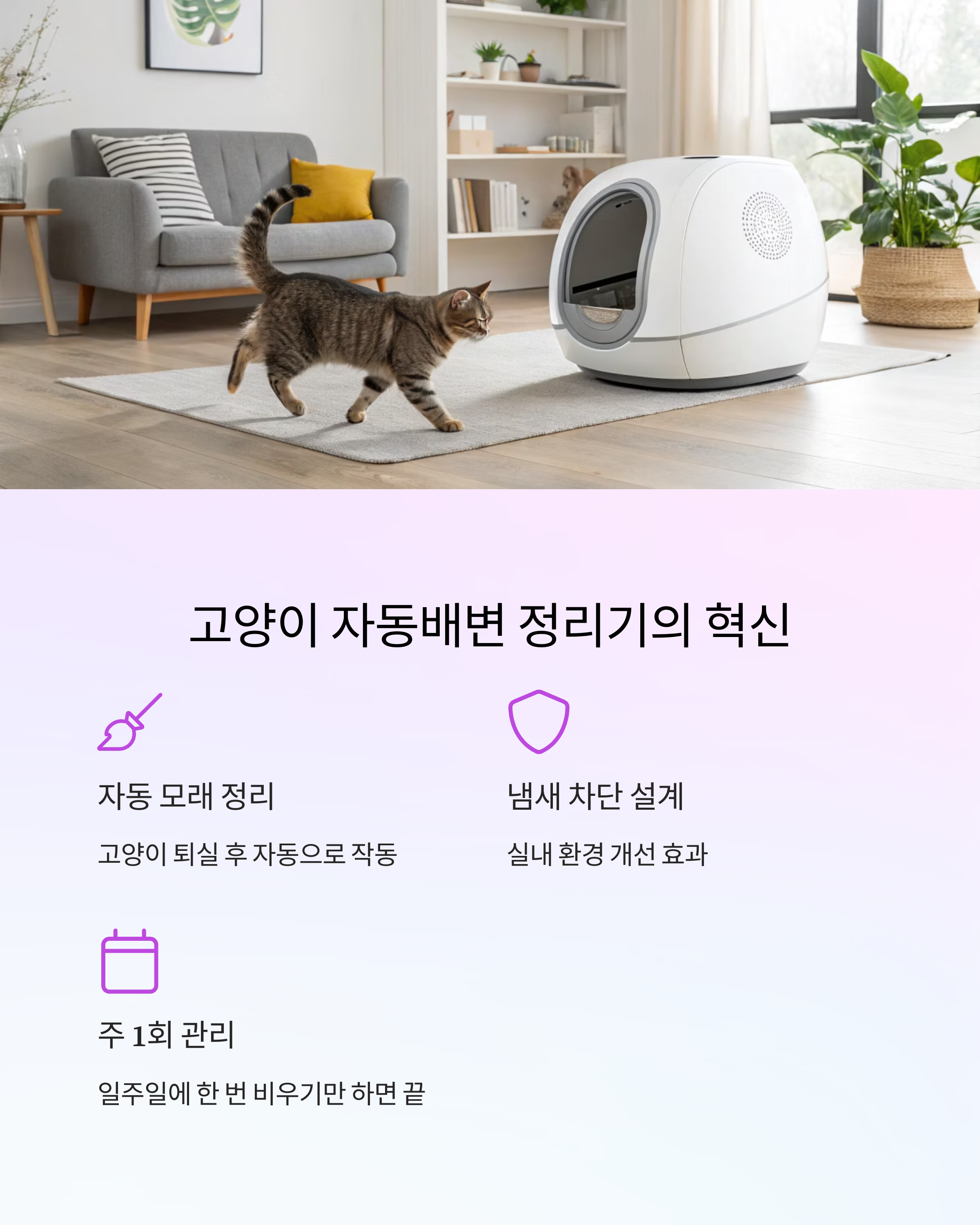 | 3 | 자동배변 정리기 | 청결 유지, 냄새 차단 | 고양이 집사 |