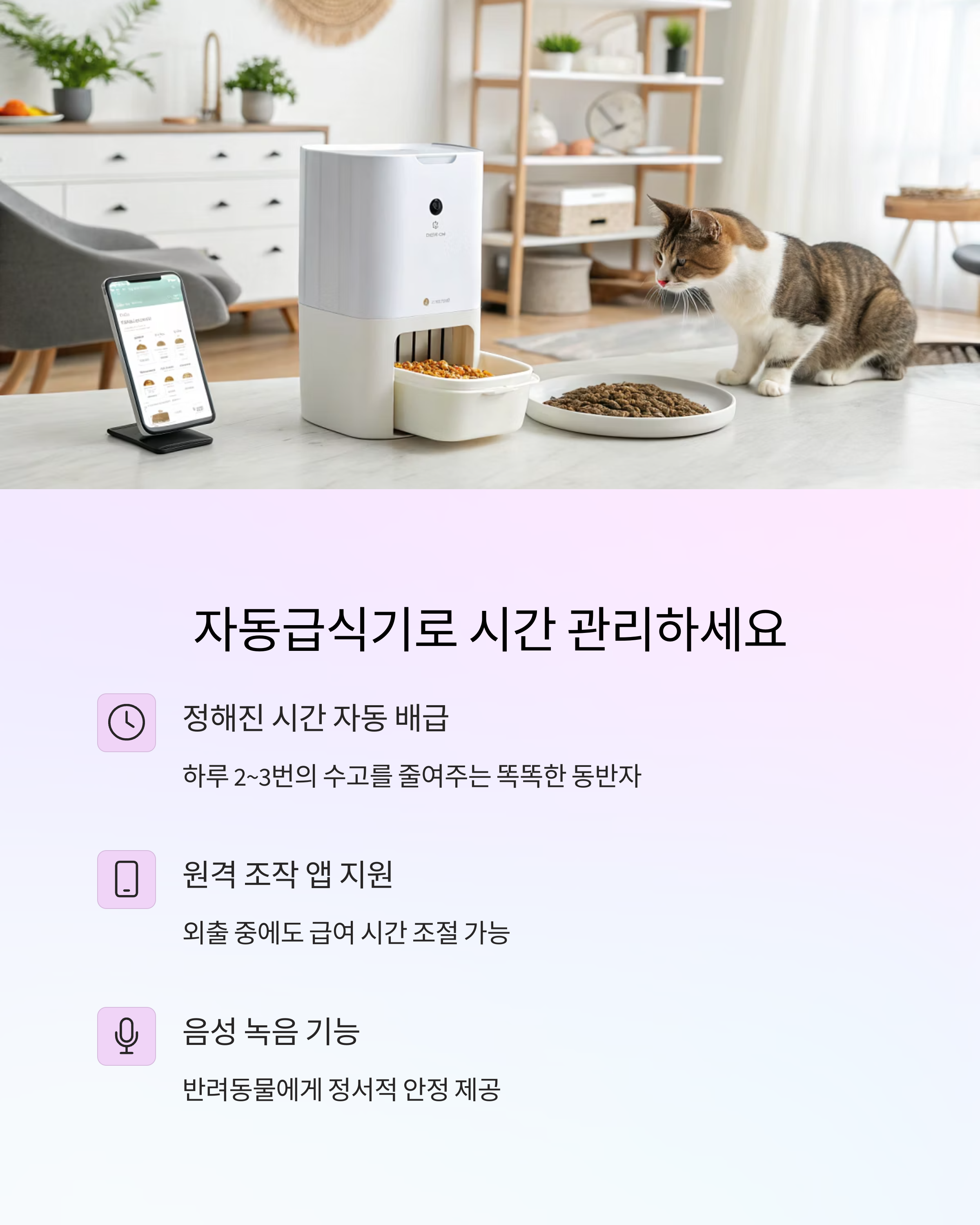 | 1 | 자동급식기 | 사료 시간 관리 가능 | 외출 잦은 반려인 |