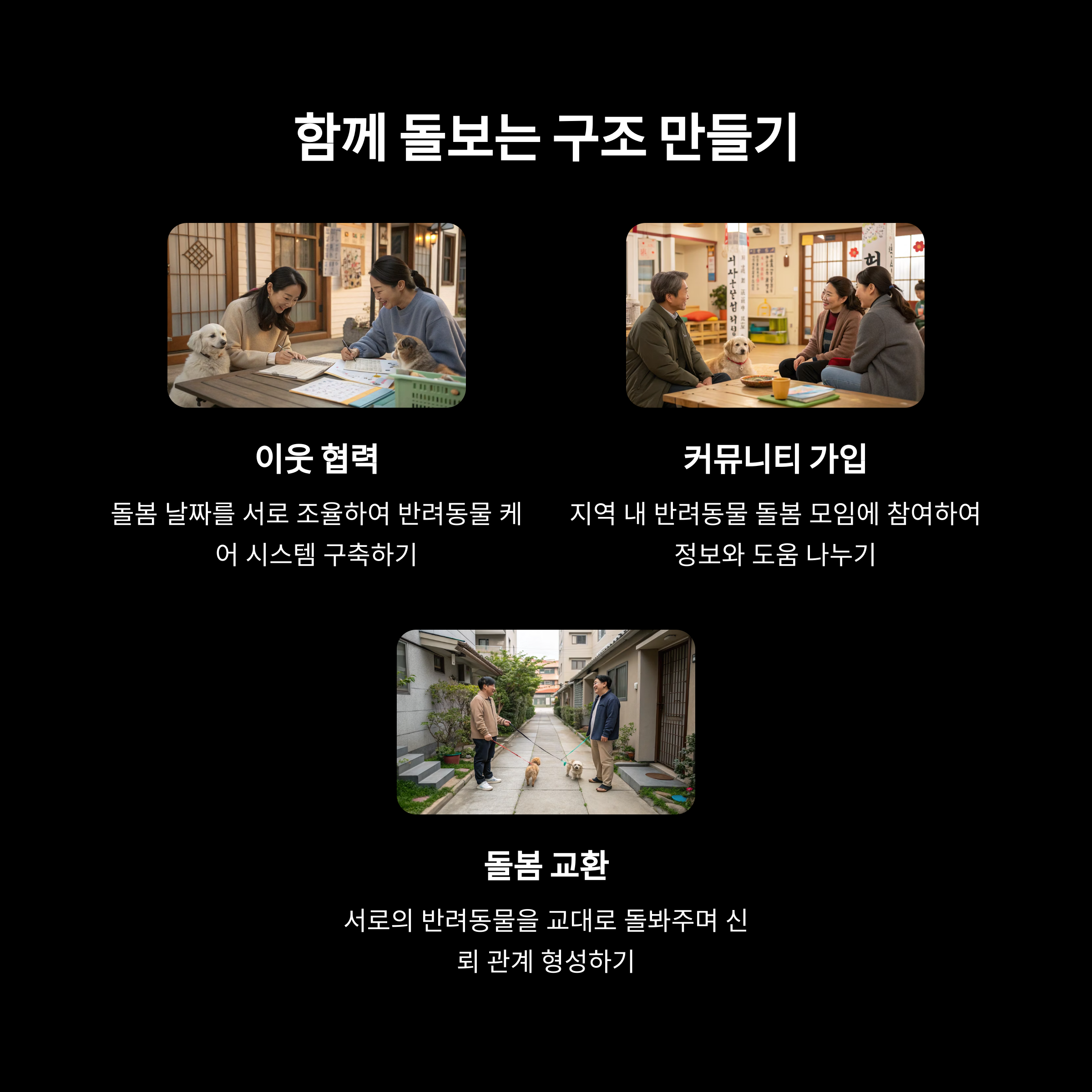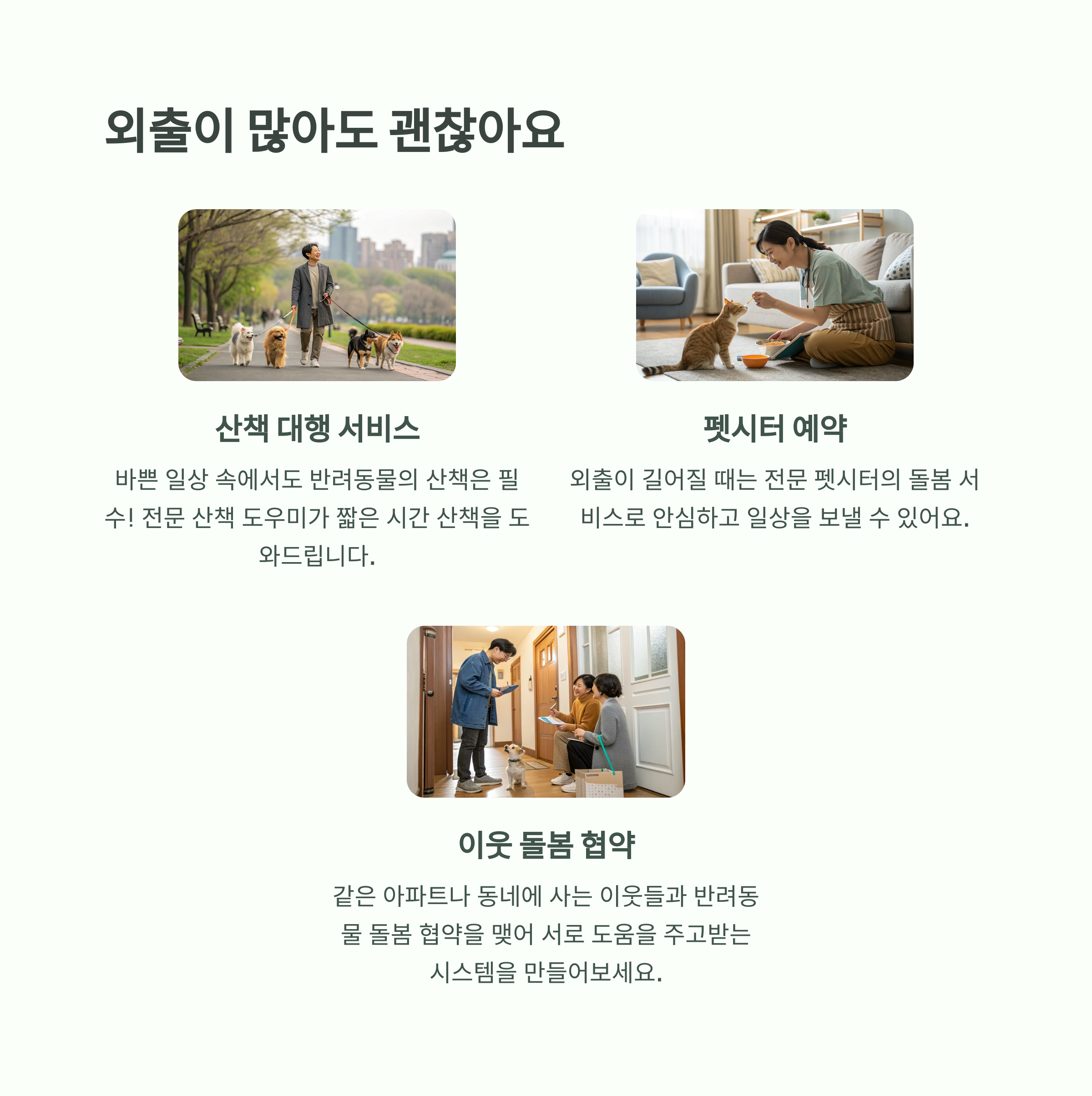 짧은 산책 대행 서비스, 펫시터 예약 플랫폼, 이웃과의 펫돌봄 협약 등