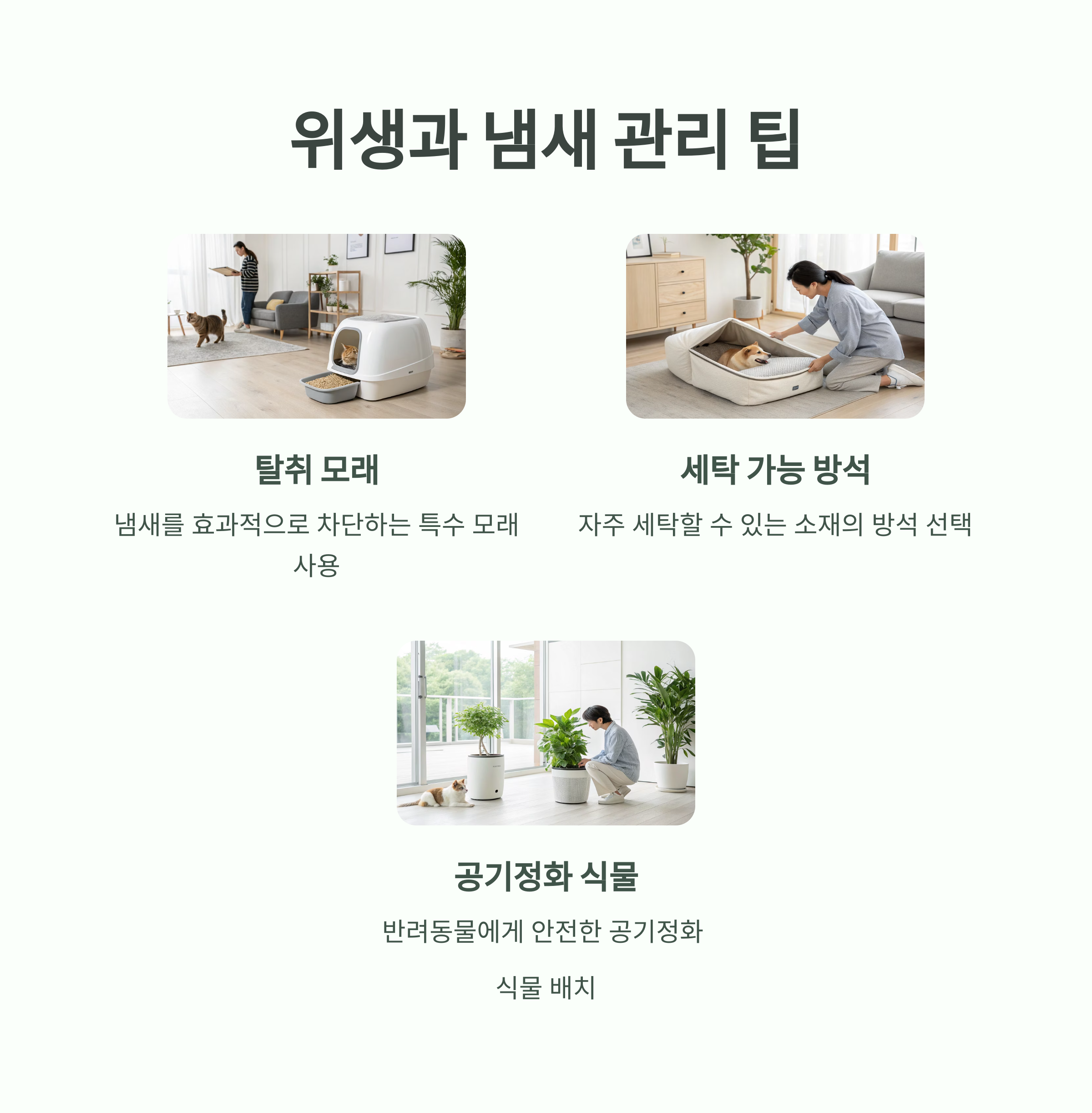 탈취 기능이 있는 모래, 자주 세탁 가능한 방석, 공기정화 식물 등을 활용해