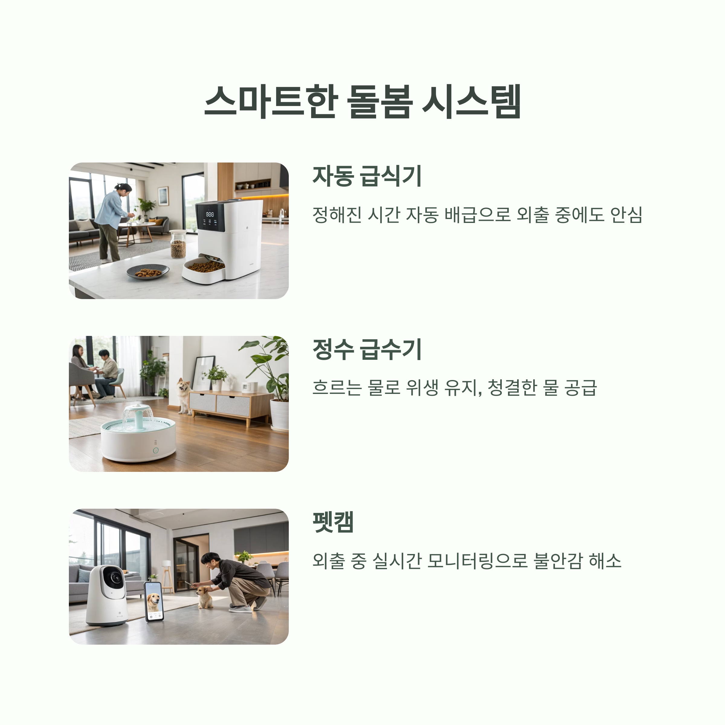 | 자동 급식기 | 정해진 시간 자동 배급 | 외출 중 식사 걱정 없음 |