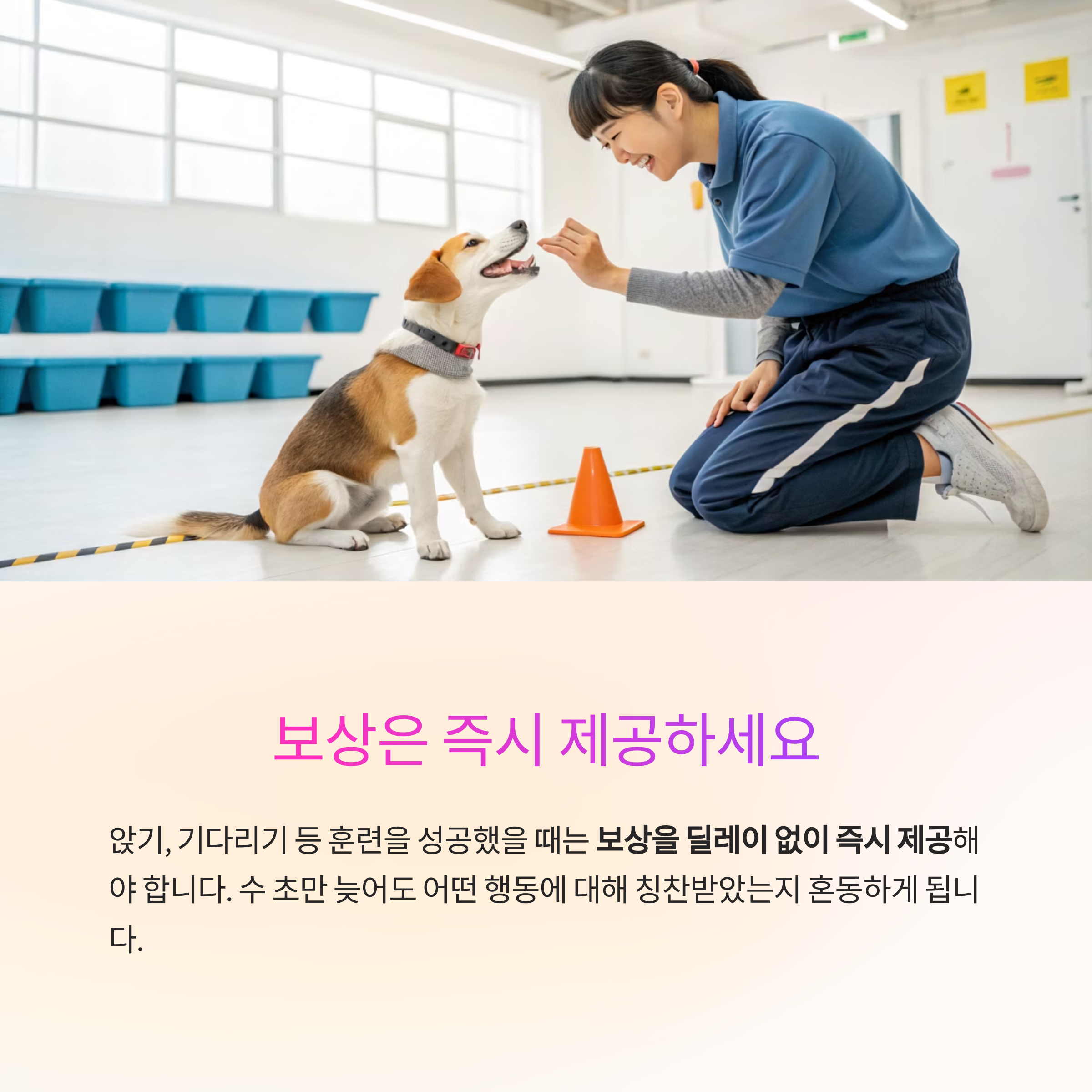 원하는 행동이 나타났을 때는 즉시 보상해야 학습이 빠릅니다.