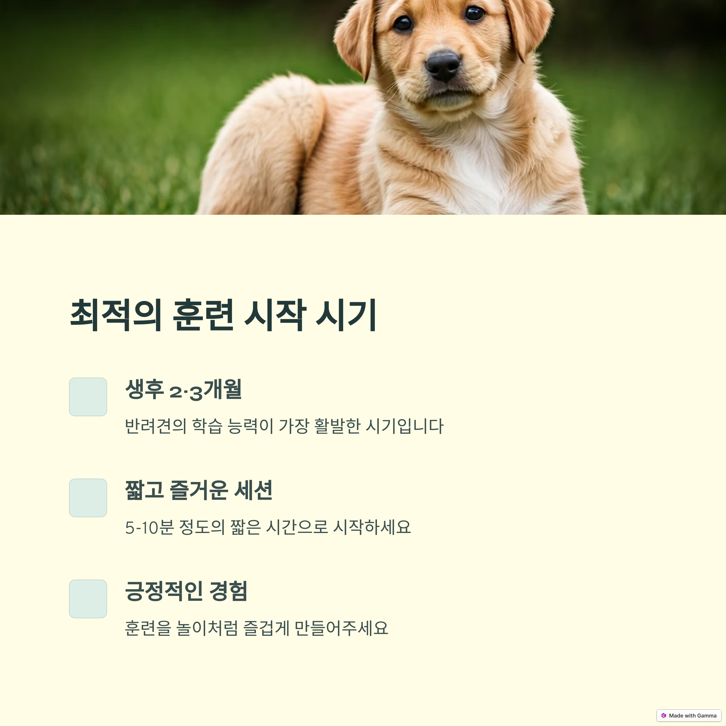 | 첫 훈련 시기 | 생후 2~3개월 무렵이 적절한 시작 시기입니다. |