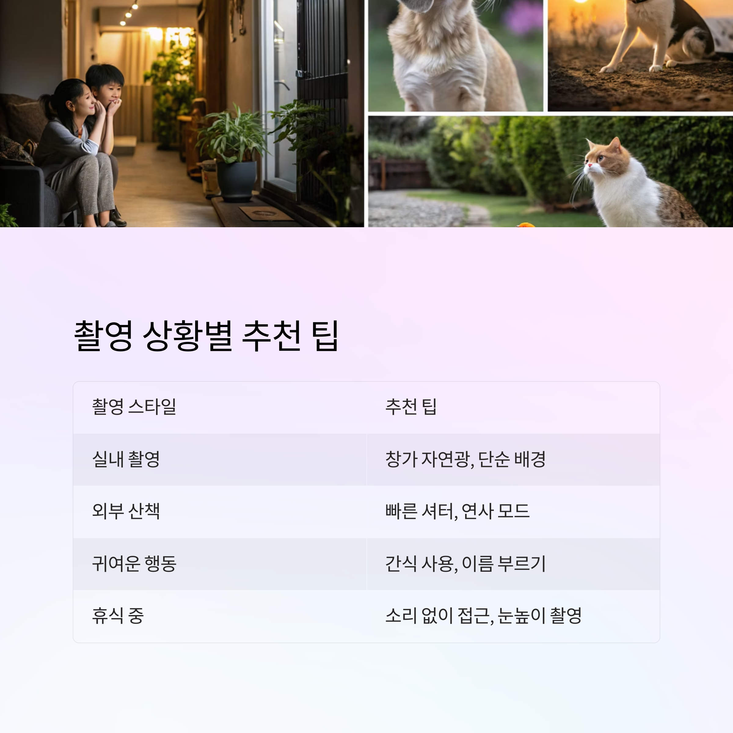 | 귀여운 행동 포착 | 간식 사용, 이름 부르기 | 시선 고정과 자연스러운 표정 유도 |