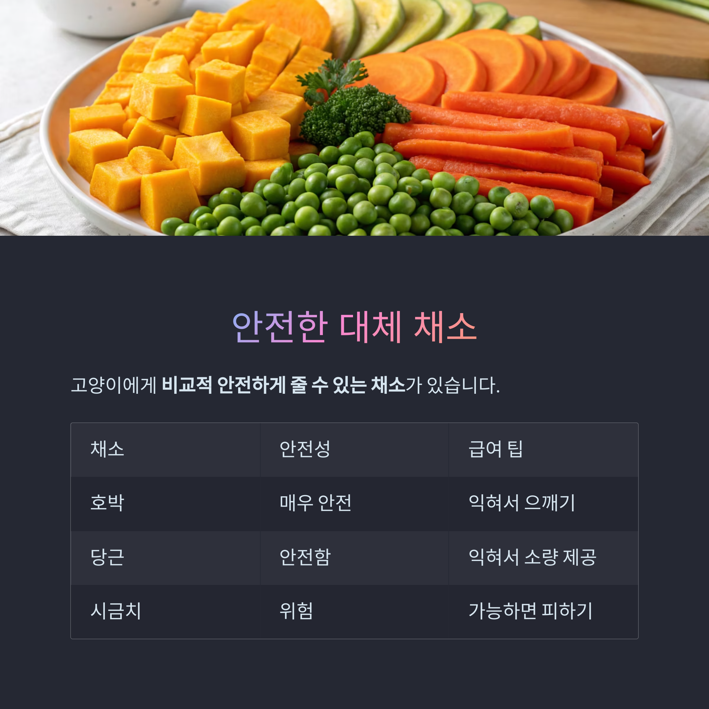 시금치 외에도 고양이에게 비교적 안전하게 줄 수 있는 채소는 일부 존재합니다.